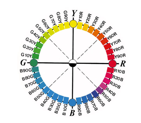 Det eksisterer fire hovedfarger som ligger med like mellomrom og som er markert med hver sin bokstav: Gult (Y), rødt (R), blått (B), grønt (G). Hvor mye fargen inneholder fargene av sort eller kulør vil tallene fortelle deg.