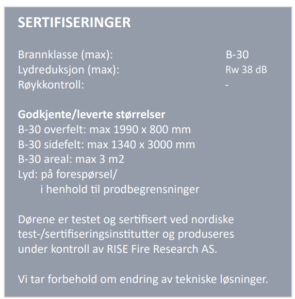 For både lyd- og brannkrav er standard glass type Pyrobel 16 EI 30(2B2).