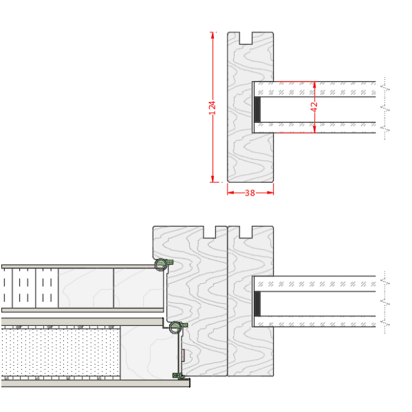 Karmdimensjonen til feltene er tilpasset karmdimensjonen for våre Rw 47 dB / Rw 50 dB-dører og er 38 mm x 124 mm, og er laget av furu, samt. leveres med not. Karmen kan leveres ubehandlet, lakkert eller malt i en NCS-farge. Andre tresorter, veggtykkelser, overflater og profiler kan også være mulig.