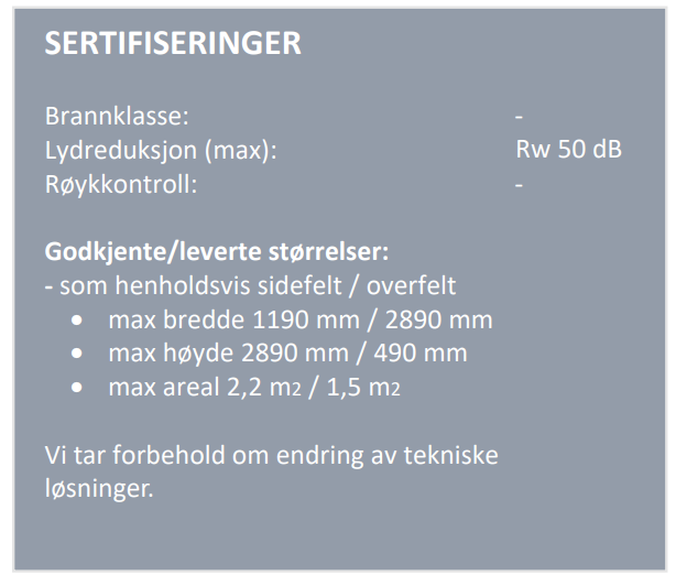 Side-/overfelt med 42mm glass i spor og lydreduksjon inntil Rw 50 dB.